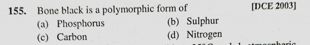 Bone black is a polymorphic form of (a) Phosphorus (b) Sulphur (c) Carbon (d) Nitrogen Bone black is a polymorphic form of (a) Phosphorus (b) Sulphur (c) Carbon (d) Nitrogen November 23, 2020 Category: Uncategorised (JEE Advanced Physics by BM Sharma + GMP Solutions) , Facebook Messenger WhatsApp Share this:TwitterFacebook Related