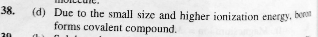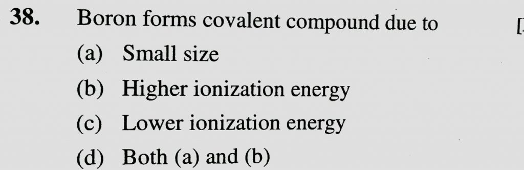 Boron forms covalent compound due to (a) small size (b) higher ionization energy (c) lower ionization energy (d) Both (a) and (b) Boron forms covalent compound due to (a) small size (b) higher ionization energy (c) lower ionization energy (d) Both (a) and (b) December 1, 2020 Category: Uncategorised (JEE Advanced Physics by BM Sharma + GMP Solutions) , Facebook Messenger WhatsApp Share this:TwitterFacebook Related