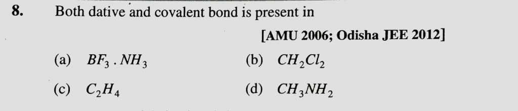 Both dative and covalent bond is present in (a) BF3.NH3 (b) CH2Cl2 (c) C2H4 (d) CH3NH2 Both dative and covalent bond is present in (a) BF3.NH3 (b) CH2Cl2 (c) C2H4 (d) CH3NH2 December 2, 2020 Category: Uncategorised (JEE Advanced Physics by BM Sharma + GMP Solutions) , Facebook Messenger WhatsApp Share this:TwitterFacebook Related