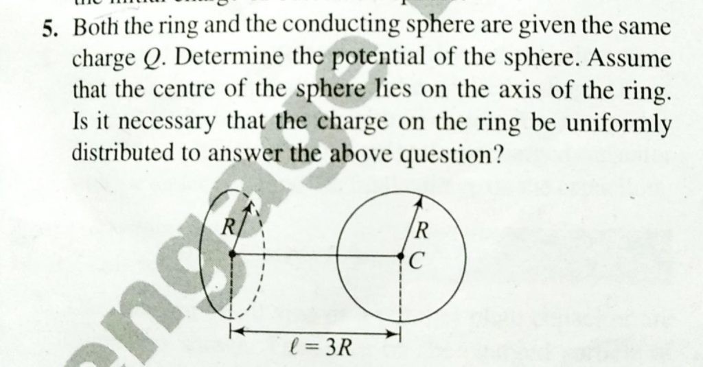 Both the ring and the conducting sphere are given the same charge Q. Determine the potential of the sphere. Assume that the centre of the sphere lies on the axis of th ring. Is it necessary that the charge on the ring be uniformly distributed to answer the above question ?