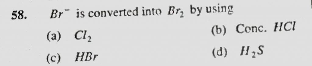 Br- is converted into Br2 by using (a) Cl2 (b) Conc. HCl (c) HBr (d) H2S Br- is converted into Br2 by using (a) Cl2 (b) Conc. HCl (c) HBr (d) H2S November 24, 2020 Category: Uncategorised (JEE Advanced Physics by BM Sharma + GMP Solutions) , Facebook Messenger WhatsApp Share this:TwitterFacebook Related
