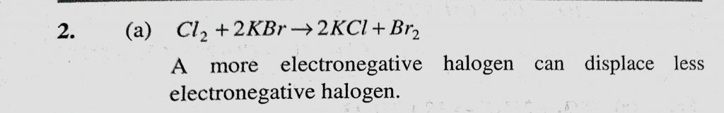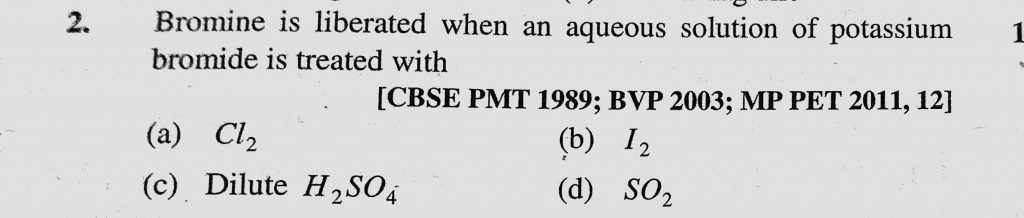 Bromine is liberated when an aqueous solution of potassium bromide is treated with (a) Cl2 (b) I2 (c) Dilute H2SO4 (d) SO2 Bromine is liberated when an aqueous solution of potassium bromide is treated with (a) Cl2 (b) I2 (c) Dilute H2SO4 (d) SO2 November 24, 2020 Category: Uncategorised (JEE Advanced Physics by BM Sharma + GMP Solutions) , Facebook Messenger WhatsApp Share this:TwitterFacebook Related