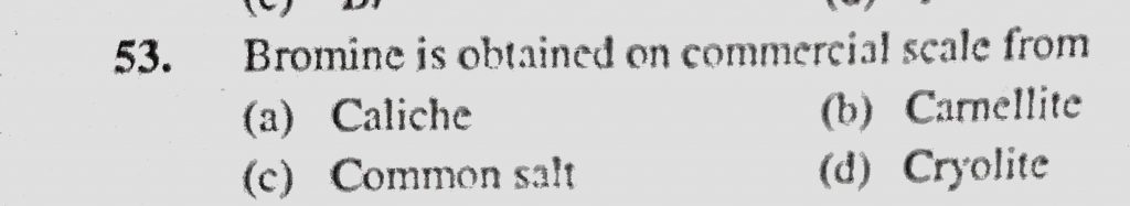 Bromine is obtained on commercial scale from (a) Caliche (b) Carnellite (c) Common salt (d) Cryolite Bromine is obtained on commercial scale from (a) Caliche (b) Carnellite (c) Common salt (d) Cryolite November 24, 2020 Category: Uncategorised (JEE Advanced Physics by BM Sharma + GMP Solutions) , Facebook Messenger WhatsApp Share this:TwitterFacebook Related