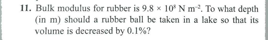 Bulk modulus for rubber is 9.8 x 10^8 N/m^2. To what depth ( in m ) should a rubber ball be taken in a lake so that its volume is decreased by 0.1% ? Bulk modulus for rubber is 9.8 x 10^8 N/m^2. To what depth ( in m ) should a rubber ball be taken in a lake so that its volume is decreased by 0.1% ? October 10, 2020 Category: Uncategorised (JEE Advanced Physics by BM Sharma + GMP Solutions) , Facebook Messenger WhatsApp Share this:TwitterFacebook Related