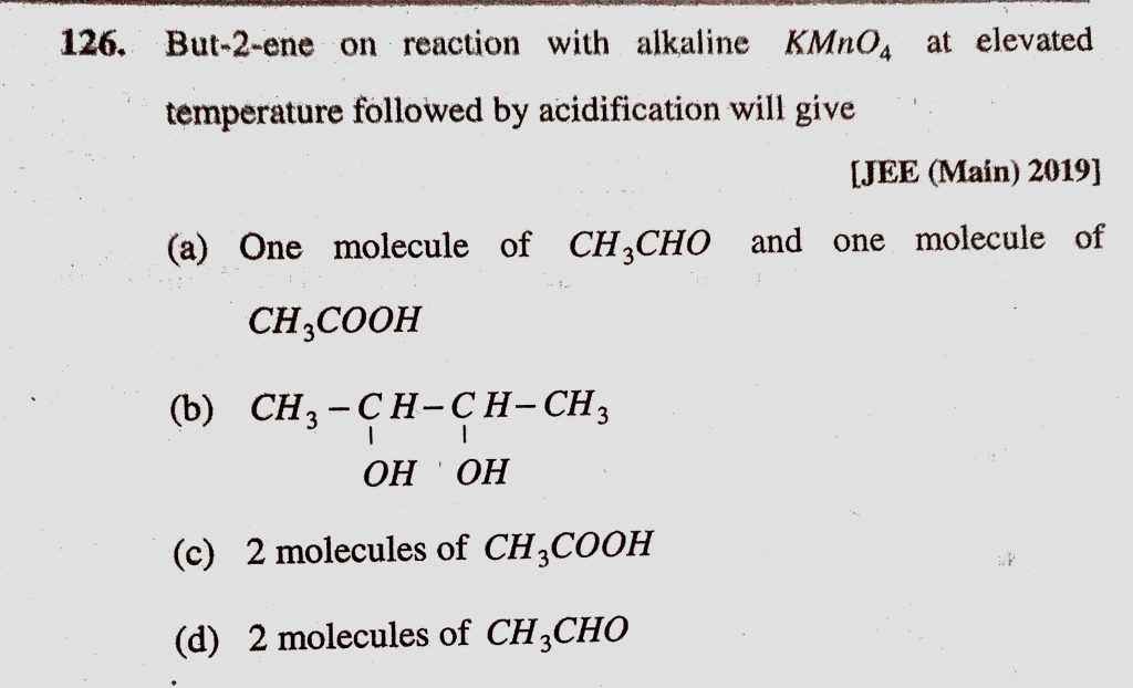 But-2-ene on reaction with alkaline KMnO4 at elevated temperature followed by acidification will give (a) One molecule of CH3CHO and one molecule of CH3COOH But-2-ene on reaction with alkaline KMnO4 at elevated temperature followed by acidification will give (a) One molecule of CH3CHO and one molecule of CH3COOH December 16, 2020 Category: Uncategorised (JEE Advanced Physics by BM Sharma + GMP Solutions) , Facebook Messenger WhatsApp Share this:TwitterFacebook Related