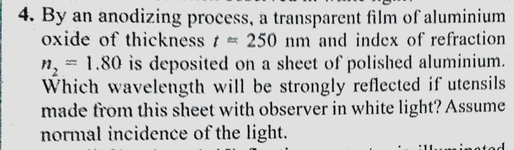 By an anodizing process, a transparent film of aluminium oxide of thickness t = 250 nm and index of refraction n2 = 1.80 is deposited on a sheet of polished aluminium. Which a transparent film of aluminium oxide of thickness t = 250 nm and index of refraction n2 = 1.80 is deposited on a sheet of polished aluminium. Which By an anodizing process October 9, 2020 Category: Uncategorised (JEE Advanced Physics by BM Sharma + GMP Solutions) , Facebook Messenger WhatsApp Share this:TwitterFacebook Related