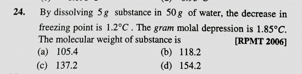 By dissolving 5 g substance in 50 g of water , the decrease in freeezing is 1.2 degree C . The gram molal depression is 1.85 degree C . The molecular weight of substance is By dissolving 5 g substance in 50 g of water the decrease in freeezing is 1.2 degree C . The gram molal depression is 1.85 degree C . The molecular weight of substance is December 14, 2020 Category: Uncategorised (JEE Advanced Physics by BM Sharma + GMP Solutions) , Facebook Messenger WhatsApp Share this:TwitterFacebook Related