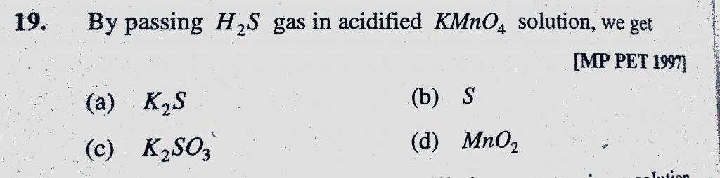 By passing H2S gas in acidified KMnO4 solution, we get (a) K2S (b) S (c) K2SO3 (d) MnO2 By passing H2S gas in acidified KMnO4 solution we get (a) K2S (b) S (c) K2SO3 (d) MnO2 December 6, 2020 Category: Uncategorised (JEE Advanced Physics by BM Sharma + GMP Solutions) , Facebook Messenger WhatsApp Share this:TwitterFacebook Related