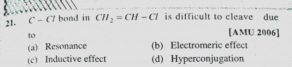 C-Cl bond in CH2 = CH – Cl is difficult to cleave due to (a) Resonance (b) Electromeric effect (c) Inductive effect C-Cl bond in CH2 = CH - Cl is difficult to cleave due to (a) Resonance (b) Electromeric effect (c) Inductive effect December 9, 2020 Category: Uncategorised (JEE Advanced Physics by BM Sharma + GMP Solutions) , Facebook Messenger WhatsApp Share this:TwitterFacebook Related