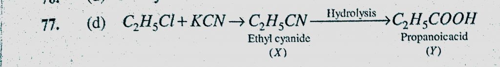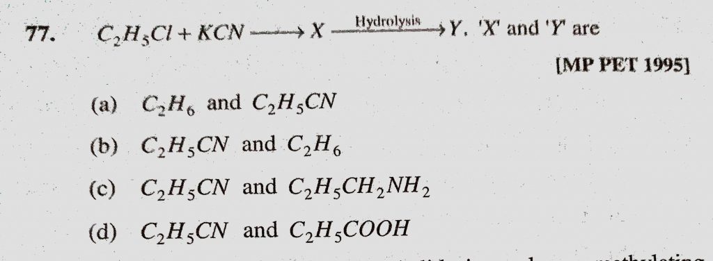 C2H5Cl + KCN to X hydrolysis Y. ‘X’ and ‘Y’ are (a) C2H6 and C2H5CN (b) C2H5CN and C2H6 (c) C2H5CN and C2H5CH2 NH2 (d) C2H5CN and C2H5COOH C2H5Cl + KCN to X hydrolysis Y. 'X' and 'Y' are (a) C2H6 and C2H5CN (b) C2H5CN and C2H6 (c) C2H5CN and C2H5CH2 NH2 (d) C2H5CN and C2H5COOH February 8, 2021 Category: Uncategorised (JEE Advanced Physics by BM Sharma + GMP Solutions) , Facebook Messenger WhatsApp Share this:TwitterFacebook Related