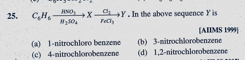 C6H6 X Y. Ine the above sequence Y is (a) 1-nitrochloro benzene (b) 3-nitrochlorobenzene (c) 4-nitrochlorobenzene (d) 1,2-nitrochlorobenzene 2-nitrochlorobenzene C6H6 X Y. Ine the above sequence Y is (a) 1-nitrochloro benzene (b) 3-nitrochlorobenzene (c) 4-nitrochlorobenzene (d) 1 December 15, 2020 Category: Uncategorised (JEE Advanced Physics by BM Sharma + GMP Solutions) , Facebook Messenger WhatsApp Share this:TwitterFacebook Related