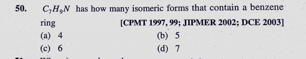 C7H9N has how many isomeric forms that contain a benzene ring (a) 4 (b) 5 (c) 6 (d) 7 C7H9N has how many isomeric forms that contain a benzene ring (a) 4 (b) 5 (c) 6 (d) 7 December 10, 2020 Category: Uncategorised (JEE Advanced Physics by BM Sharma + GMP Solutions) , Facebook Messenger WhatsApp Share this:TwitterFacebook Related
