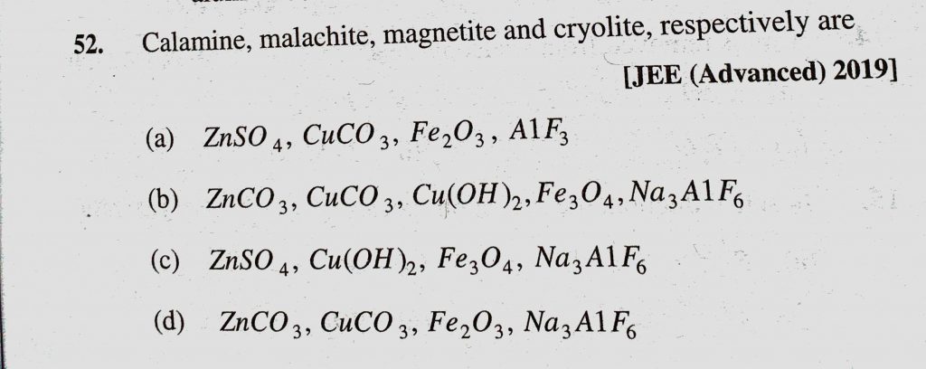 Calamine, malachite, magnetite and cryolite, respectively are (a) ZnSO4, CuCO3, Fe2O3, AlF3 AlF3 Calamine CuCO3 Fe2O3 magnetite and cryolite malachite respectively are (a) ZnSO4 November 12, 2020 Category: Uncategorised (JEE Advanced Physics by BM Sharma + GMP Solutions) , Facebook Messenger WhatsApp Share this:TwitterFacebook Related