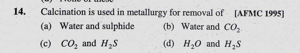 Calcination is used in metallurgy for removal of (a) Water and sulphide (b) Water and CO2 (c) CO2 and H2S (d) H2O and H2S Calcination is used in metallurgy for removal of (a) Water and sulphide (b) Water and CO2 (c) CO2 and H2S (d) H2O and H2S November 11, 2020 Category: Uncategorised (JEE Advanced Physics by BM Sharma + GMP Solutions) , Facebook Messenger WhatsApp Share this:TwitterFacebook Related