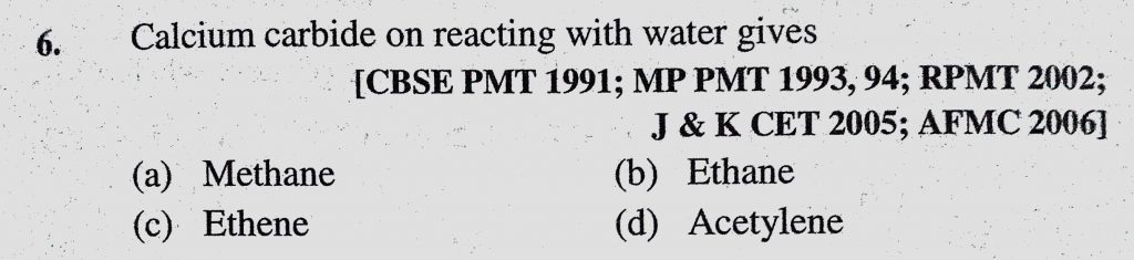 Calcium carbide on reacting with water gives (a) Methane (b) Ethane (c) Ethene (d) Acetylene Calcium carbide on reacting with water gives (a) Methane (b) Ethane (c) Ethene (d) Acetylene December 14, 2020 Category: Uncategorised (JEE Advanced Physics by BM Sharma + GMP Solutions) , Facebook Messenger WhatsApp Share this:TwitterFacebook Related