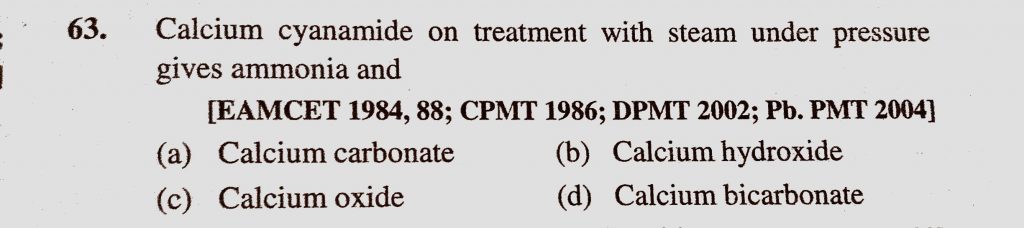 Calcium cyanamide on treatment with steam under pressure gives ammonia and (a) Calcium carbonate (b) Calcium hydroxide (c) Calcium oxide Calcium cyanamide on treatment with steam under pressure gives ammonia and (a) Calcium carbonate (b) Calcium hydroxide (c) Calcium oxide November 18, 2020 Category: Uncategorised (JEE Advanced Physics by BM Sharma + GMP Solutions) , Facebook Messenger WhatsApp Share this:TwitterFacebook Related