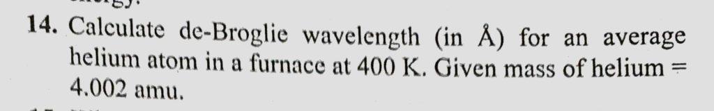 Calculate de-Broglie wavelength ( in A) for an average helium atom in a furnance at 400 K. Given mass of helium = 4.002 amu. Calculate de-Broglie wavelength ( in A) for an average helium atom in a furnance at 400 K. Given mass of helium = 4.002 amu. October 14, 2020 Category: Uncategorised (JEE Advanced Physics by BM Sharma + GMP Solutions) , Facebook Messenger WhatsApp Share this:TwitterFacebook Related
