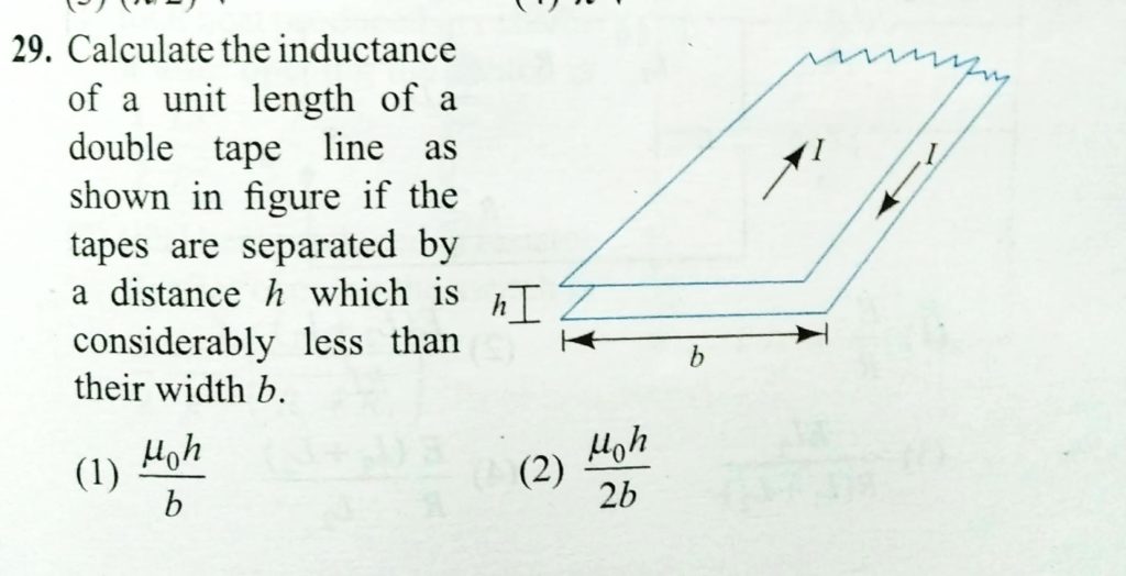 Calculate the inductance of a unit length of a double tape line as shown in figure if the tapes are seperated by a distance h which is considerably less than their width b. Calculate the inductance of a unit length of a double tape line as shown in figure if the tapes are seperated by a distance h which is considerably less than their width b. October 22, 2020 Category: Uncategorised (JEE Advanced Physics by BM Sharma + GMP Solutions) , Facebook Messenger WhatsApp Share this:TwitterFacebook Related