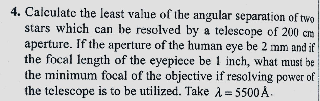 Calculate the least value of the angular separation of two stars which can be resolved by a telescope of 200 cm aperture. If the aperture of the human eye be 2 mm and it the focal length Calculate the least value of the angular separation of two stars which can be resolved by a telescope of 200 cm aperture. If the aperture of the human eye be 2 mm and it the focal length October 11, 2020 Category: Uncategorised (JEE Advanced Physics by BM Sharma + GMP Solutions) , Facebook Messenger WhatsApp Share this:TwitterFacebook Related