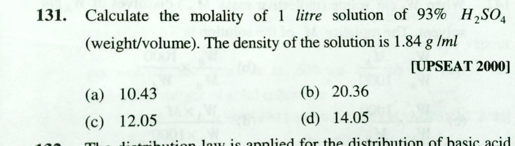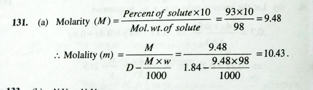 Calculate the molaity of 1 litre solution of 93 % H2SO4 (weight / volume ) . The density of the solution is 1.84 g/ml Calculate the molaity of 1 litre solution of 93 % H2SO4 (weight / volume ) . The density of the solution is 1.84 g/ml December 12, 2020 Category: Uncategorised (JEE Advanced Physics by BM Sharma + GMP Solutions) , Facebook Messenger WhatsApp Share this:TwitterFacebook Related