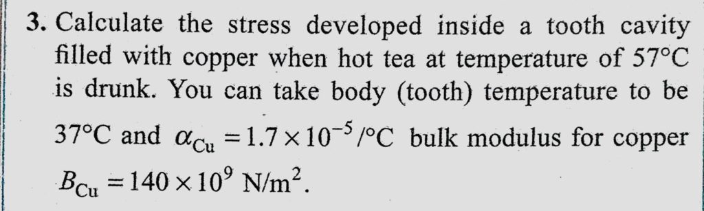 Calculate the stress developed inside a tooth cavity filled with copper when hot tea at temperature of 57 C is drunk. You can take body (tooth) temperature to be 37 C and alpha cu Calculate the stress developed inside a tooth cavity filled with copper when hot tea at temperature of 57 C is drunk. You can take body (tooth) temperature to be 37 C and alpha cu October 23, 2020 Category: Uncategorised (JEE Advanced Physics by BM Sharma + GMP Solutions) , Facebook Messenger WhatsApp Share this:TwitterFacebook Related