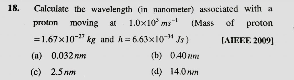 Calculate the wavelength ( in nanometer ) assoiated with a proton moving at 1.0 x 10^3m/s (mass of proton = 1.67 x 10^-27 kg and h = 6.63 x 10^-34 Js ) Calculate the wavelength ( in nanometer ) assoiated with a proton moving at 1.0 x 10^3m/s (mass of proton = 1.67 x 10^-27 kg and h = 6.63 x 10^-34 Js ) November 27, 2020 Category: Uncategorised (JEE Advanced Physics by BM Sharma + GMP Solutions) , Facebook Messenger WhatsApp Share this:TwitterFacebook Related