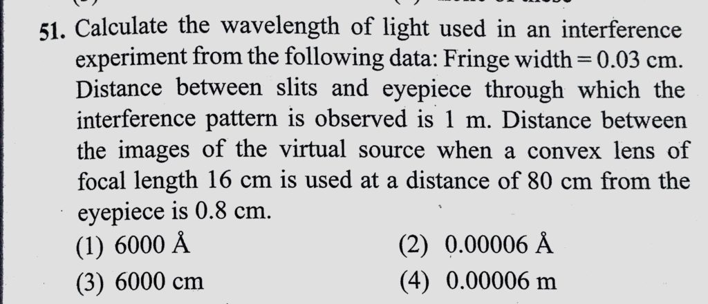 Calculate the wavelength of light used in an interference experiment from the following data: Fringe width = 0.03 cm. Distance between slits and eyepiece through which the interference Calculate the wavelength of light used in an interference experiment from the following data: Fringe width = 0.03 cm. Distance between slits and eyepiece through which the interference October 10, 2020 Category: Uncategorised (JEE Advanced Physics by BM Sharma + GMP Solutions) , Facebook Messenger WhatsApp Share this:TwitterFacebook Related