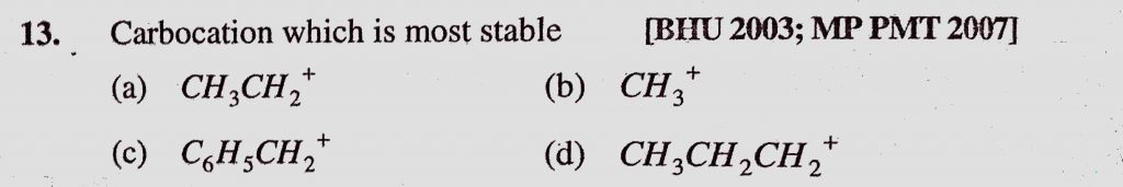 Carbocation which is most stable (a) CH3CH2+ (b) CH3 + (c) C6H5CH2+ (d) CH3CH2CH2+ Carbocation which is most stable (a) CH3CH2+ (b) CH3 + (c) C6H5CH2+ (d) CH3CH2CH2+ December 11, 2020 Category: Uncategorised (JEE Advanced Physics by BM Sharma + GMP Solutions) , Facebook Messenger WhatsApp Share this:TwitterFacebook Related