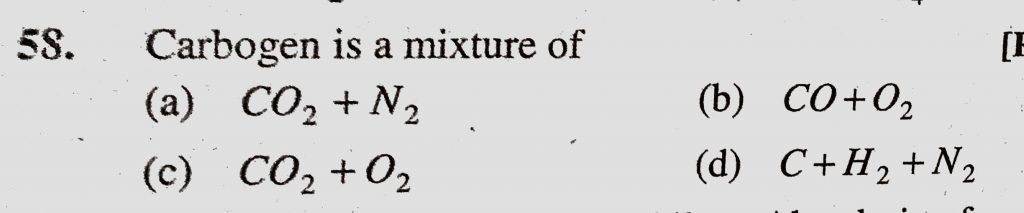 Carbogen is a mixture of (a) CO2 + N2 (b) CO + O2 (c) CO2 + O2 (d) C + H2 + N2 Carbogen is a mixture of (a) CO2 + N2 (b) CO + O2 (c) CO2 + O2 (d) C + H2 + N2 November 18, 2020 Category: Uncategorised (JEE Advanced Physics by BM Sharma + GMP Solutions) , Facebook Messenger WhatsApp Share this:TwitterFacebook Related