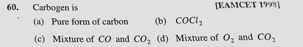 Carbogen is (a) Pure form of carbon (b) COCl2 (c) Mixture of CO and CO2 (d) Mixture of O2 and CO2 Carbogen is (a) Pure form of carbon (b) COCl2 (c) Mixture of CO and CO2 (d) Mixture of O2 and CO2 November 23, 2020 Category: Uncategorised (JEE Advanced Physics by BM Sharma + GMP Solutions) , Facebook Messenger WhatsApp Share this:TwitterFacebook Related