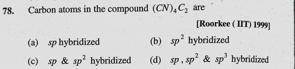 Carbon atoms in the compound (CN)4C2 are (a) sp hybridized (b) sp2 hybridized (c) sp and sp2 hybridized Carbon atoms in the compound (CN)4C2 are (a) sp hybridized (b) sp2 hybridized (c) sp and sp2 hybridized December 11, 2020 Category: Uncategorised (JEE Advanced Physics by BM Sharma + GMP Solutions) , Facebook Messenger WhatsApp Share this:TwitterFacebook Related