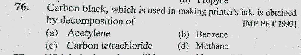Carbon black, which is used in making printer’s ink, is obtained by decomposition of (a) Acetylene (b) Benzene (c) Carbon tetrachloride Carbon black is obtained by decomposition of (a) Acetylene (b) Benzene (c) Carbon tetrachloride which is used in making printer's ink December 12, 2020 Category: Uncategorised (JEE Advanced Physics by BM Sharma + GMP Solutions) , Facebook Messenger WhatsApp Share this:TwitterFacebook Related