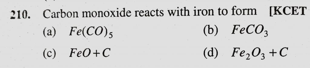 Carbon monoxide reacts with iron to form (a) Fe(CO)5 (b) FeCO3 (c) FeO + C (d) Fe2O3 + C Carbon monoxide reacts with iron to form (a) Fe(CO)5 (b) FeCO3 (c) FeO + C (d) Fe2O3 + C December 2, 2020 Category: Uncategorised (JEE Advanced Physics by BM Sharma + GMP Solutions) , Facebook Messenger WhatsApp Share this:TwitterFacebook Related