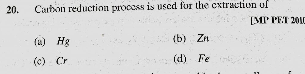 Carbon reduction process is used for the extraction of (a) Hg (b) Zn (c) Cr (d) Fe Carbon reduction process is used for the extraction of (a) Hg (b) Zn (c) Cr (d) Fe November 12, 2020 Category: Uncategorised (JEE Advanced Physics by BM Sharma + GMP Solutions) , Facebook Messenger WhatsApp Share this:TwitterFacebook Related