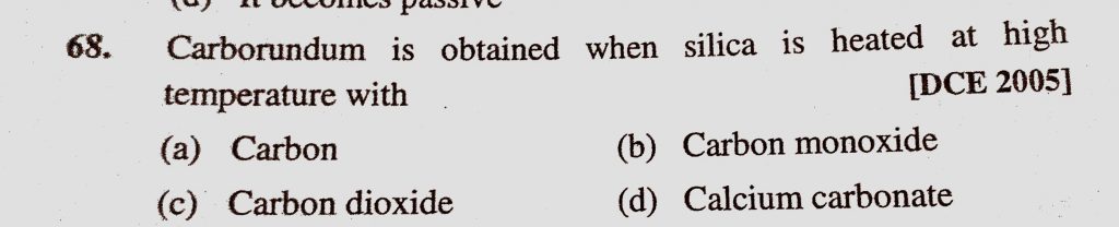 Carborundum is obtained when silica is heated at high temperature with (a) Carbon (b) Carbon monoxide (c) Carbon dioxide (d) Calcium carbonate Carborundum is obtained when silica is heated at high temperature with (a) Carbon (b) Carbon monoxide (c) Carbon dioxide (d) Calcium carbonate November 17, 2020 Category: Uncategorised (JEE Advanced Physics by BM Sharma + GMP Solutions) , Facebook Messenger WhatsApp Share this:TwitterFacebook Related