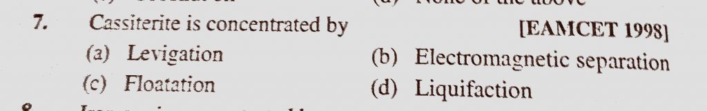 Cassiterite is concentrated by (a) Levigation (b) Electromagnetic separation (c) Floatation (d) Liquifaction Cassiterite is concentrated by (a) Levigation (b) Electromagnetic separation (c) Floatation (d) Liquifaction November 11, 2020 Category: Uncategorised (JEE Advanced Physics by BM Sharma + GMP Solutions) , Facebook Messenger WhatsApp Share this:TwitterFacebook Related