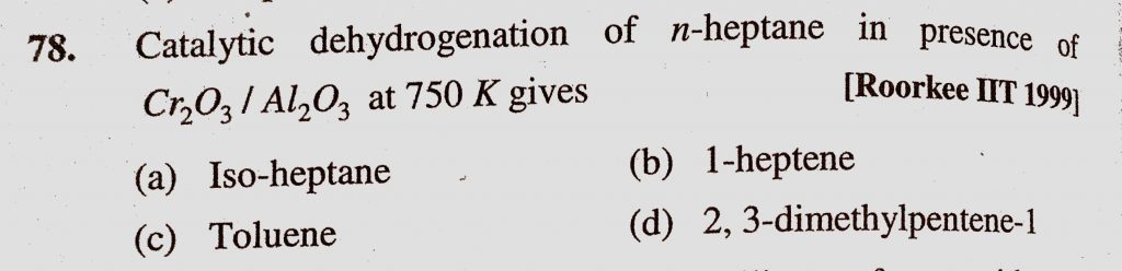 Catalytic dehydrogenation of n-heptane in presence of Cr2O3 / Al2O3 at 750 K gives (a) Iso-heptane (b) 1-heptene (c) Toluene (d) 2, 3-dimethylpentene-1 3-dimethylpentene-1 Catalytic dehydrogenation of n-heptane in presence of Cr2O3 / Al2O3 at 750 K gives (a) Iso-heptane (b) 1-heptene (c) Toluene (d) 2 December 16, 2020 Category: Uncategorised (JEE Advanced Physics by BM Sharma + GMP Solutions) , Facebook Messenger WhatsApp Share this:TwitterFacebook Related