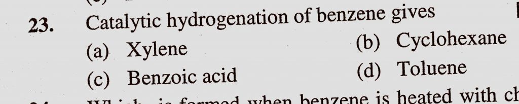 Catalytic hydrogenation of benzene gives (a) Xylene (b) Cyclohexane (c) Benzoic acid (d) Toluene Catalytic hydrogenation of benzene gives (a) Xylene (b) Cyclohexane (c) Benzoic acid (d) Toluene December 15, 2020 Category: Uncategorised (JEE Advanced Physics by BM Sharma + GMP Solutions) , Facebook Messenger WhatsApp Share this:TwitterFacebook Related