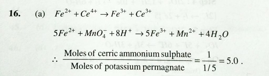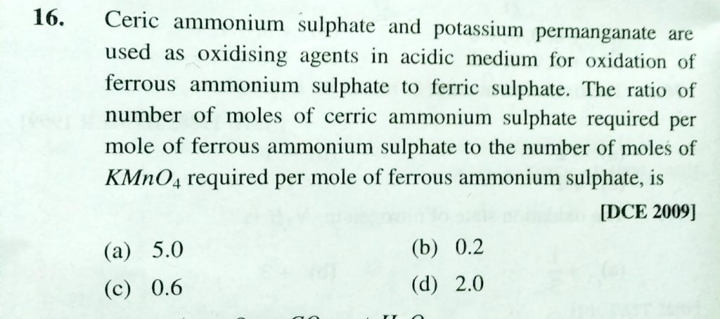 Ceric ammonium sulphate and p[otassium permaganate are used as oxidising agents in acidic medium for oxidation of ferrous ammonium sulphate. The ratio of number of moles of cerric ammonium sulphate required per mole of ferrous ammonium sulphate to the number of moles of KMnO4 required per mole of ferrous ammonium sulphate is