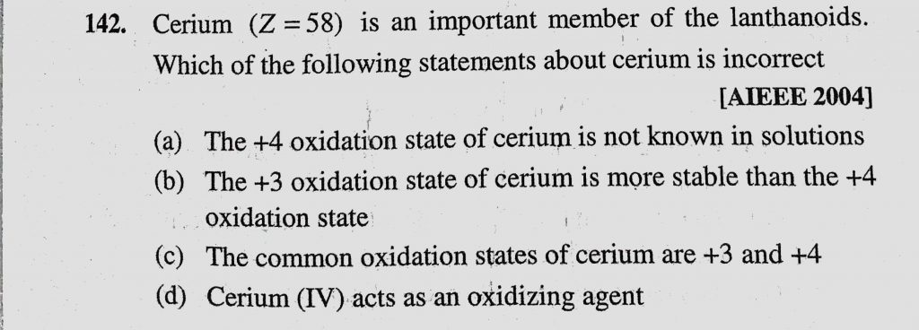 Cerium (Z = 58) is an important member of the lanthanoids. Which of the following statements about cerium is incorrect (a) The +4 oxidation state of cerium is not known in solutions Cerium (Z = 58) is an important member of the lanthanoids. Which of the following statements about cerium is incorrect (a) The +4 oxidation state of cerium is not known in solutions November 30, 2020 Category: Uncategorised (JEE Advanced Physics by BM Sharma + GMP Solutions) , Facebook Messenger WhatsApp Share this:TwitterFacebook Related