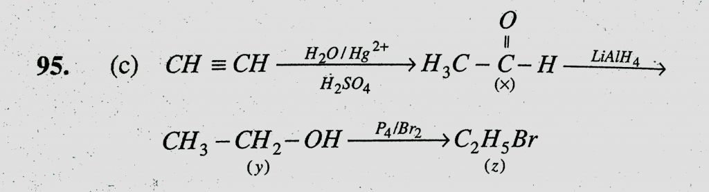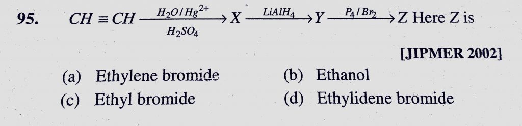 CH≡CH H2O/Hg2+ H2SO4 X LiAlH4 Y P4/Br2 Z Here Z is (a) Ethylene bromide (b) Ethanol (c) Ethyl bromide (d) Ethylidene bromide CH≡CH H2O/Hg2+ H2SO4 X LiAlH4 Y P4/Br2 Z Here Z is (a) Ethylene bromide (b) Ethanol (c) Ethyl bromide (d) Ethylidene bromide December 14, 2020 Category: Uncategorised (JEE Advanced Physics by BM Sharma + GMP Solutions) , Facebook Messenger WhatsApp Share this:TwitterFacebook Related