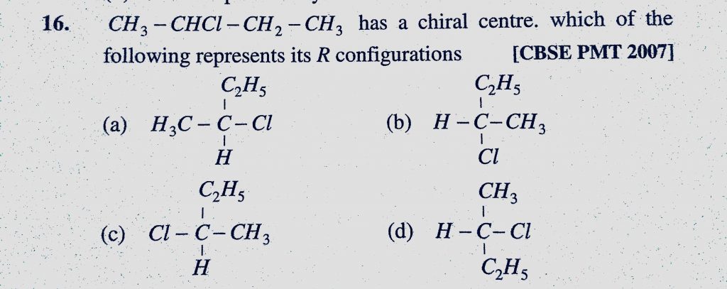 CH3-CHCl-CH2-CH3 has a chiral centre. Which of the following represents its R configurations CH3-CHCl-CH2-CH3 has a chiral centre. Which of the following represents its R configurations December 10, 2020 Category: Uncategorised (JEE Advanced Physics by BM Sharma + GMP Solutions) , Facebook Messenger WhatsApp Share this:TwitterFacebook Related