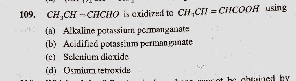 CH3CH=CHCHO is oxidized to CH3CH=CHCOOH using (a) Alkaline potassium permanganate (b) Acidified potassium permanganate (c) Selenium dioxide CH3CH=CHCHO is oxidized to CH3CH=CHCOOH using (a) Alkaline potassium permanganate (b) Acidified potassium permanganate (c) Selenium dioxide December 14, 2020 Category: Uncategorised (JEE Advanced Physics by BM Sharma + GMP Solutions) , Facebook Messenger WhatsApp Share this:TwitterFacebook Related