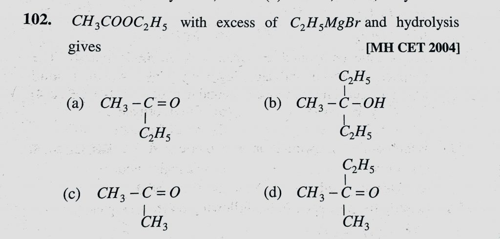CH3COOC2H5 with excess of C2H5MgBr and hydrolysis gives CH3COOC2H5 with excess of C2H5MgBr and hydrolysis gives February 13, 2021 Category: Uncategorised (JEE Advanced Physics by BM Sharma + GMP Solutions) , Facebook Messenger WhatsApp Share this:TwitterFacebook Related