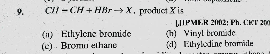 CH=_ CH+ HBr to X product X is (a) Ethylene bromide (b) Vinyl bromide (c) Bromo ethane (d) Ethyledine bromide CH=_ CH+ HBr to X product X is (a) Ethylene bromide (b) Vinyl bromide (c) Bromo ethane (d) Ethyledine bromide December 15, 2020 Category: Uncategorised (JEE Advanced Physics by BM Sharma + GMP Solutions) , Facebook Messenger WhatsApp Share this:TwitterFacebook Related