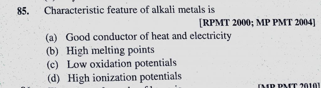 Characteristic feature of alkali metals is (a) Good conductor of heat and electricity (b) High melting points Characteristic feature of alkali metals is (a) Good conductor of heat and electricity (b) High melting points November 15, 2020 Category: Uncategorised (JEE Advanced Physics by BM Sharma + GMP Solutions) , Facebook Messenger WhatsApp Share this:TwitterFacebook Related