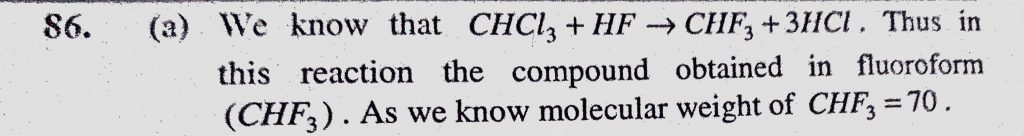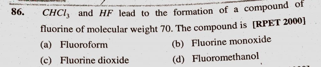 CHCl3 and HF lead to the formation of a compound of fluorine of molecular weight 70. The compound is (a) Fluoroform (b) Fluorine monoxide (c) Fluorine dioxide CHCl3 and HF lead to the formation of a compound of fluorine of molecular weight 70. The compound is (a) Fluoroform (b) Fluorine monoxide (c) Fluorine dioxide February 8, 2021 Category: Uncategorised (JEE Advanced Physics by BM Sharma + GMP Solutions) , Facebook Messenger WhatsApp Share this:TwitterFacebook Related