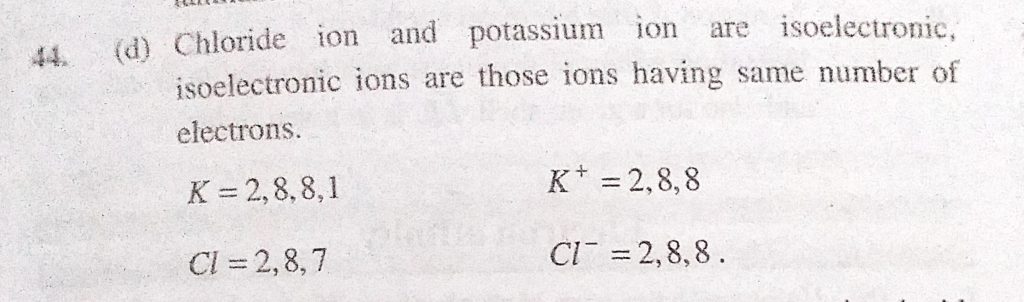 Chloride ion and potassium ion are isoelectronic. Then (a) Potassium ion is relatively bigger (b) Depends on the other cation and anion (c) Their size are same Chloride ion and potassium ion are isoelectronic. Then (a) Potassium ion is relatively bigger (b) Depends on the other cation and anion (c) Their size are same November 9, 2020 Category: Uncategorised (JEE Advanced Physics by BM Sharma + GMP Solutions) , Facebook Messenger WhatsApp Share this:TwitterFacebook Related