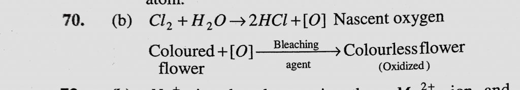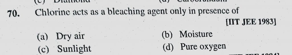 Chlorine acts as a bleaching agent only in presence of (a) Dry air (b) Moisture (c) Sunlight (d) Pure oxygen Chlorine acts as a bleaching agent only in presence of (a) Dry air (b) Moisture (c) Sunlight (d) Pure oxygen November 27, 2020 Category: Uncategorised (JEE Advanced Physics by BM Sharma + GMP Solutions) , Facebook Messenger WhatsApp Share this:TwitterFacebook Related