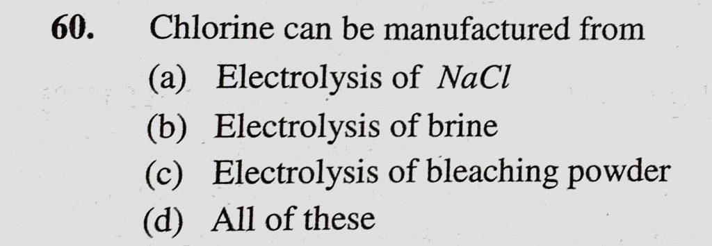 Chlorine can manufactured from (a) Electrolysis of NaCl (b) Electrolysis of brine (c) Electrolysis of bleaching powder Chlorine can manufactured from (a) Electrolysis of NaCl (b) Electrolysis of brine (c) Electrolysis of bleaching powder November 24, 2020 Category: Uncategorised (JEE Advanced Physics by BM Sharma + GMP Solutions) , Facebook Messenger WhatsApp Share this:TwitterFacebook Related